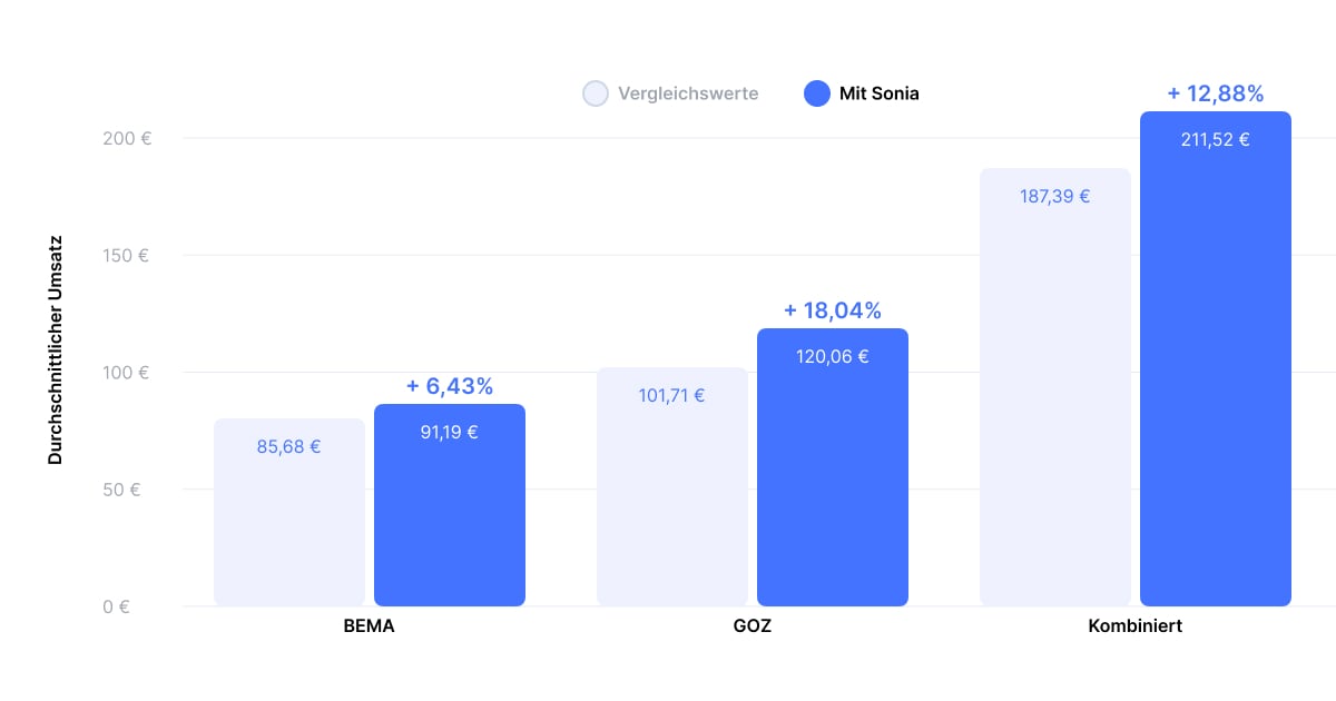Die Doku, die Sonia erledigt, steigert spürbar den Umsatz. Konkrete Zahlen bietet eine Sonia Test-Praxis aus dem Raum Hessen. Untersucht wurde der Umsatz vor und nach dem Einsatz von Sonia anhand von zwei- oder mehrflächigen Mehrkostenfüllungen mit Zusatzleistungen im GKV-Bereich. Die Ergebnisse dieser Datenerhebung zeigen eine durchschnittliche Umsatzsteigerung von 12,88 Prozent pro Behandlung. Die Umsätze erhöhten sich im BEMA-Bereich um 6,43 Prozent und im GOZ-Bereich um 18,04 Prozent, was einem kombinierten durchschnittlichen Gesamtumsatz von 211,52 Euro pro Behandlung entspricht. Die Daten deuten darauf hin, dass eine KI-gestützte Dokumentation zu einer verbesserten Abrechnung und damit zu einem höheren Umsatz beitragen kann.